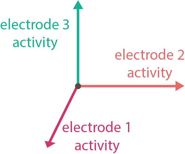 Figure 1. A three dimensional space where each axis is the activity of one electrode. This space enables us to visualise how electrode activities vary together, rahter than considering each electrode separately.
