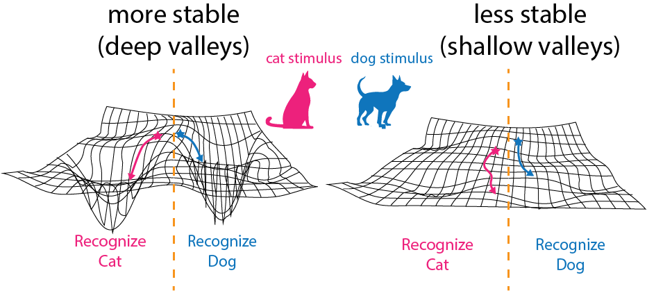 To bring this intuition into our neural state space, let’s pretend for a minute that the trajectories in neural state space evolve on a landscape that obeys the laws of gravity (I know, bear with me). If this landscape consists of two valleys, intuition tells us that if our trajectory starts anywhere on the edge of one of the valleys, it will end up at the bottom. To motivate this, let’s say ending up at the bottom of one valley corresponds to thinking about the concept “dog” and the other valley corresponds to the concept “cat.” When prompted with differing cues—say, a picture of a dog and a picture of a cat—you can easily tell them apart, even if the photos are a bit faded and grainy. Start your neural trajectory anywhere in the valley, and you end up at the bottom, thus “retrieving” the concept from your memory10.
