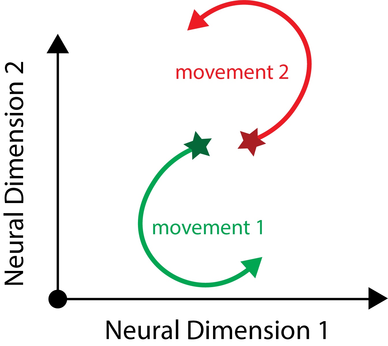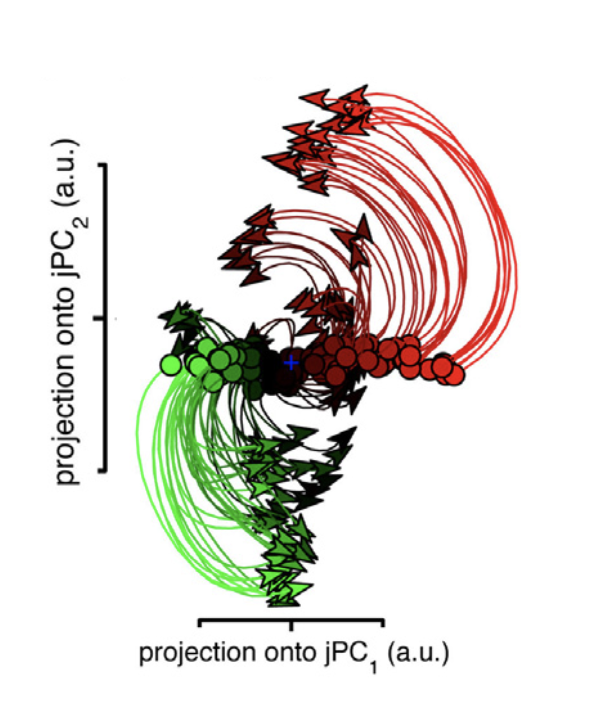 Figure 4. (a, left) Trajectories recorded during reaching tasks show clear rotational structure when visualised in two dimensions. Different rotations correspond to differ- ent reaching movements, coloured red and green here. Figure is from Churchland et. al. 20126. (b, right) My mockup of the same result.