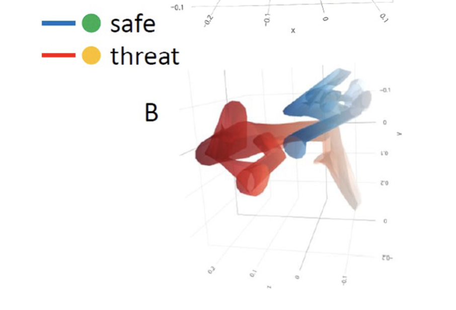 Another interesting example—and relevant for our interest in anxious thought loops—are the neural trajectories (from fMRI) of responses to both “threatening” and “safe” stimuli. Remarkably, in each case, the trajectories travel into completely different regions of state space. In this case, there is clearly a “safe landscape” and a “threat landscape,” and the full neural landscape can be thought of as the combination of these two.