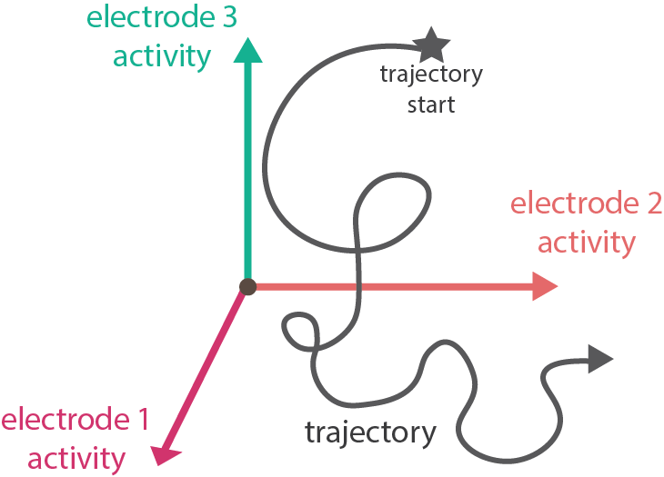 Now, if we go back to our electrodes measuring electrical activity over time, we can trace out a path, or a trajectory, through the state space.